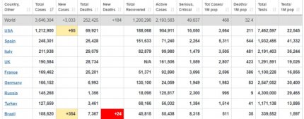 Що важливо також розуміти, станом на ранок 5 травня у світі 3 646 304 діагностованих випадків захворювання. 1 200 296 осіб одужало та 252 425 померло від ускладнень, спричинених хворобою. Зокрема, у США 1 212 900 ( + 24 713 за минулу добу ) випадків захворювання на коронавірус, в Іспанії 248 301 ( +1179 ), Італії 211 938 ( +1221 ). Найбільше померлих від вірусу у США (69 921) Італії ( 29 079 ) та Британії ( 28 734 ). Найбільше одужань від COVID-19 в США ( 188 027 ), Іспанії ( 151 633 ), Німеччині ( 132 700 ).