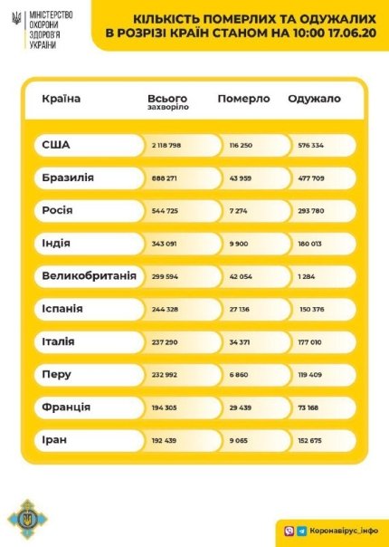 Варто звернути увагу на те, що число підтверджених випадків коронавірусу у світі сягнуло 8 млн 576 тис. Активними залишаються 3 млн 607 тис випадків захворювання. Померли від ускладнень COVID-19 вже 456 тис осіб, вилікувались – 4 млн 513 тис людей. За останню добу зареєстрували 140 тис нових інфікувань та 5126 смертей. Лідером за темпами поширення хвороби залишаються США та Бразилія – 28 та 23 тис відповідно. За цей час в Індії зафіксували майже 14 тис, у Росії – 7,7 тис, у Пакистані – 5,3 тис, у Мексиці – майже 5 тис. 18 червня у Бразилії померла рекордна кількість людей – 1204 особи. У Мексиці загинули 770 хворих, у США – 747, в Індії – 342.