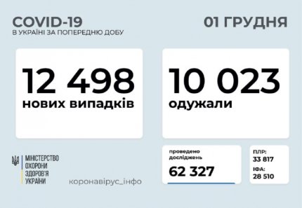 Кількість хворих на коронавірус в Україні продовжує швидко зростати — у вівторок, 1 грудня, зафіксували 12 498 нових випадків зараження. Загальна кількість хворих COVID-19 налічує вже 745 123 особи, з них 12 548 пацієнтів померли через ускладнення, спровоковані коронавірусною хворобою. За останню добу найбільша кількість підтверджених випадків зареєстрована у м. Київ (1 799), Одеській (889), Дніпропетровській (870), Київській (841) та Львівській (813) областях. Про це повідомляє ONLINE.UA з посиланням на офіційні дані Міністерства охорони здоров’я.