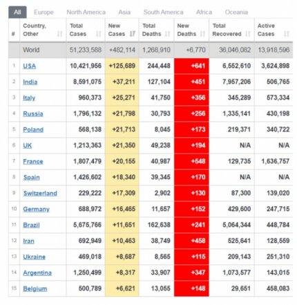 Варто звернути увагу на те, що протягом 9 листопада в світі зафіксували 482 тисячі хворих на COVID-19. Що важливо розуміти, 219 656 нових хворих зафіксовано в країнах Європи. В Україні за минулу добу діагностували 8687 заражень. У країнах Європи лідерами антирейтингу за кількістю нових випадків COVID-19 є Італія, Польща, Велика Британія, Франція і Україна, яка займає 9-е місце. В аналогічному світовому антирейтингу наша країна на 13-му місці. Станом на ранок 10 листопада в світі зафіксували 51 мільйон випадків зараження. Успішно перенесли хворобу і вилікувалися 36 мільйонів пацієнтів. 1 269 120 хворих померли.