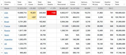 Варто звернути увагу на те, що станом на ранок 11 листопада в світі за добу діагностували 542 тисячі хворих на COVID-19. Померло цього дня 9 186 пацієнтів. 234 920 нових хворих зафіксовано в країнах Європи. В Україні за минулу добу діагностували 10 179 заражень. У країнах Європи лідерами антирейтингу за кількістю нових випадків COVID-19 є Італія, Польща, Британія, Франція і Україна, яка займає 8-е місце. У відповідному світовому антирейтингу Україна знаходиться на 13-му місці. Станом на момент публікації, в світі зафіксовано 51,8 млн випадків зараження. Змогли перемогти хворобу 36,4 млн пацієнтів. 1,27 млн хворих померли.
