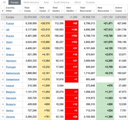 Кількість хворих на коронавірус в Європі 11 серпня (фото - скріншот worldometers.info)