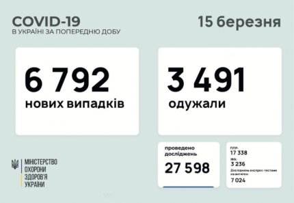 Кількість хворих на коронавірус в Україні стрімко зростає - в понеділок, 15 березня, зафіксували 6792 нових випадків зараження, з них ковідом захворіли 326 дітей і 109 медпрацівників, госпіталізовано 2497 осіб. За минулу добу було проведено 27598 тестів на коронавірус - 17338 ПЛР, 3236 ІФА і 7024 експрес-тестів на антиген. Загальна кількість хворих COVID-19 налічує вже 1467548 осіб, з них 28433 пацієнтів померли через ускладнення, спровокованих коронавірусною хворобою. За останню добу найбільша кількість підтверджених випадків зареєстровано в Львівській, Житомирській, Київській, Дніпропетровській та Вінницькій областях. Вже 1,2 млн українців змогли перемогти коронавірус, 3491 з них за останню добу. Про це повідомляє ONLINE.UA з посиланням на офіційні дані Міністерства охорони здоров'я.