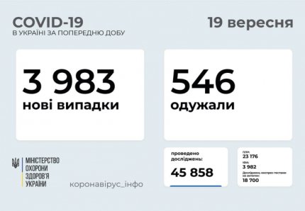 19 вересня в Україні зафіксували 3983 нових випадків зараження коронавірусом, госпіталізовано 1767 пацієнтів, померли 46 осіб. За останню добу одужали 546 українців.