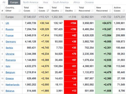 Кількість хворих на коронавірус в Європі 19 вересня (фото - скріншот worldometers.info)