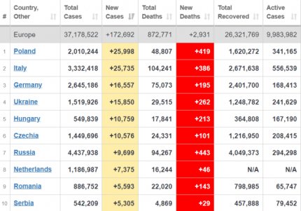 Кількість хворих на коронавірус в світі також продовжує зростати - станом на 20 березня захворіло майже 123 млн людей. За минулу добу в світі діагностували 514 тисяч нових випадків. Більше кількість хворих зростає в Бразилії, США, Індії, Польщі та Італії. Україна у світовій статистиці по щоденному приросту хворих знаходиться на 8 місці, серед країн Європи - на 4 місці. На сьогоднішній день майже 21 млн осіб продовжують хворіти, померли від ускладнень, викликаних COVID-19, більш 2,712 млн пацієнтів, вилікувалися - 99 млн людей.