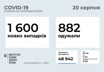 1 600 нових випадків COVID-19 зафіксовано в Україні станом на 20 серпня 2021 року. Зокрема, захворіли 112 дітей та 46 медпрацівників. Загальна кількість хворих сягнула 2 271 826 осіб, померли в результаті хвороби 53 394 українця.