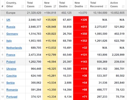 Кількість хворих на коронавірус в світі не знижується - станом на 21 грудня захворіли майже 77,1 млн осіб. За минулу добу в світі діагностували більш 546 тисяч нових випадків. Більше кількість хворих зростає в США, Великій Британії, Росії, Бразилії та Індії. Україна у світовій статистиці по щоденному приросту хворих знаходиться на 15 місці, серед країн Європи - на 8 місці. На сьогоднішній день майже 21,4 млн осіб продовжують хворіти, померли від ускладнень, викликаних COVID-19, більш 1,699 млн людей, вилікувалися - 54 млн пацієнтів.