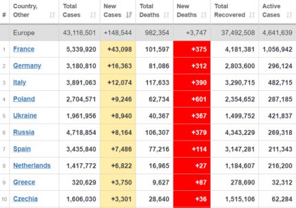 Кількість хворих на коронавірус в Європі 21 квітня (фото - скріншот worldometers.info)