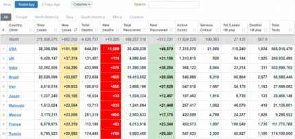 Кількість хворих на коронавірус у світі 21 серпня серпня (фото - скріншот worldometers.info)