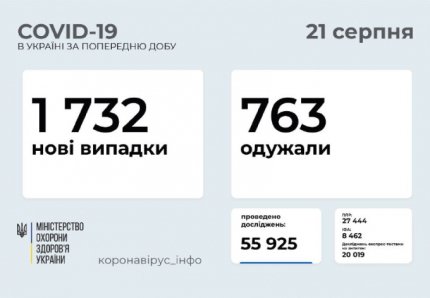 1 732 нові випадки COVID-19 зафіксовано в Україні станом на 21 серпня 2021 року. Зокрема, захворіли 104 дитини та 32 медпрацівники. Загальна кількість хворих сягнула 2 273 558 осіб. Померли в результаті хвороби 53 432 українця.