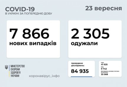 7 866 нових випадків коронавірусу виявили в Україні станом на 23 вересня 2021 року. Так, вказано, що захворіли 667 дітей та 175 медичних працівників. Загальна кількість хворих в країні сягнула 2 370 425 осіб.