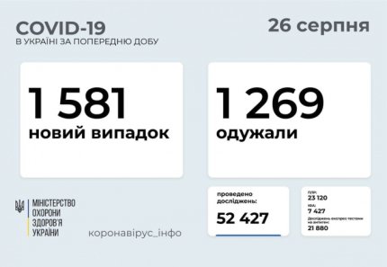 26 серпня в Україні зафіксували 1581 нових випадків зараження коронавірусом, госпіталізовано 464 пацієнтів, померли 45 осіб. За останню добу одужали 1269 українців.