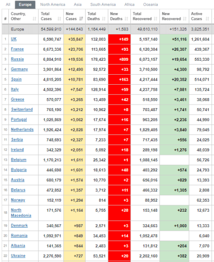 Кількість хворих на коронавірус в Європі 26 серпня (фото - скріншот worldometers.info)