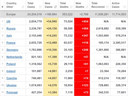 Кількість хворих на коронавірус в світі продовжує зростати - станом на 4 січня захворіли 85,5 млн осіб. За минулу добу в світі діагностували почи 510 тисяч нових випадків - це рекордний приріст хворих з початку пандемії. Більше кількість хворих зростає в США, Великій Британії, Росії, Бразилії та Індії. Україна у світовій статистиці по щоденному приросту хворих знаходиться на 21 місці, серед країн Європи - на 10 місці. На сьогоднішній день майже 23 млн осіб продовжують хворіти, померли від ускладнень, викликаних COVID-19, більш 1,850 млн людей, вилікувалися - 60,5 млн пацієнтів.