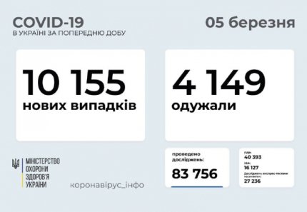Кількість хворих на коронавірус в Україні знову росте — у п'ятниці, 5 березня, зафіксували 10 155 нових випадків зараження. Загальна кількість хворих COVID-19 налічує вже 1 384 917 осіб, з них 26 763 пацієнта померли через ускладнення, спровоковані коронавірусною хворобою. За останню добу найбільша кількість підтверджених випадків зареєстрована у м. Києві (910), Вінницькій (816), Закарпатській (748), Івано-Франківській (737) та Житомирській (695) областях. Про це повідомляє ONLINE.UA з посиланням на офіційні дані Міністерства охорони здоров'я.