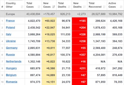 За минулу добу в світі захворіли коронавірусом 535 тисяч людей. Найбільше кількість хворих зростає в Індії, Франції, Туреччини, США і Бразилії. Україна у світовій статистиці по щоденному приросту хворих знаходиться на 8 місці, серед країн Європи - на 4 місці.