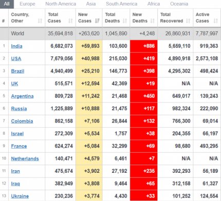 Що важливо розуміти, протягом минулої доби у світі підтвердили більше 263 тисяч випадків коронавірусу. Україна опинилась на 13 місці серед країн світу за числом нових хворих. Лідерами за числом виявлених за добу хворих залишаються Індія, США та Бразилія. Також значну кількість випадків виявили у Великій Британії, Аргентині, Росії та Колумбії. Україна за числом нових хворих опинилась біля Іраку, Ірану, Мексики та Індонезії. За минулу добу від ускладнень захворювання померли 4248 осіб. Пандемія вже забрала життя 1 мільйона 45 тисяч осіб. За цей час захворіли 35,6 млн осіб. Водночас вилікувались 26,8 млн. Активними залишаються 7,7 млн випадків.