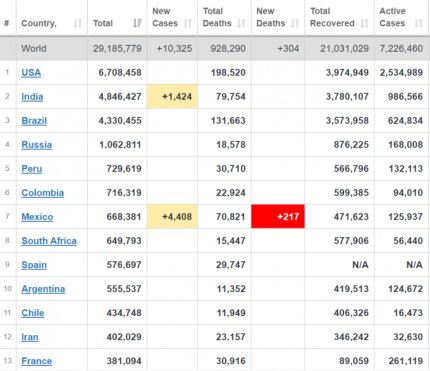 Кількість хворих на коронавірус в світі також безперервно зростає - за станом на 14 вересня захворіли вже майже 29,2 млн осіб. За останню добу в світі діагностували понад 244 тисяч нових випадків. Більше кількість хворих зростає в Індії, Бразилії та США. Україна у світовій статистиці по захворюваності коронавірусів знаходиться вже на 25-му місці, серед країн Європи - на 7 місці.
