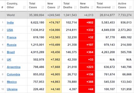 Кількість хворих на коронавірус в світі також невпинно зростає - станом на 5 жовтня захворіли вже понад 35,4 млн осіб. За останню добу в світі діагностували 249 тисяч нових випадків. Більше кількість хворих зростає в США, Індії, Франції та Росії, яка обійшла Бразилію у світовій статистиці по щоденному приросту хворих. За останню добу в РФ виявлено 10,5 тисяч нових випадків COVID-19. Україна у світовій статистиці по захворюваності на коронавірус знаходиться на 25-му місці, серед країн Європи - на 7 місці. На сьогоднішній день понад 7,7 млн осіб продовжують хворіти, померли від ускладнень, викликаних COVID-19, більш 1,041 млн людей, вилікувалися - 26,6 млн пацієнтів.