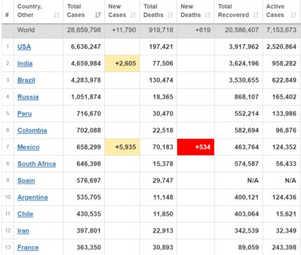 Кількість хворих на коронавірус в світі також стрімко зростає - станом на 13 вересня захворіли вже понад 28,9 млн осіб. За останню добу в світі діагностували більш 281 тисячі нових випадків. Більше кількість хворих зростає в Індії, Бразилії та США. Україна у світовій статистиці по захворюваності коронавірусів знаходиться вже на 25-му місці, серед країн Європи - на 7 місці.