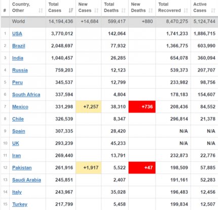 Кількість хворих на коронавірус в світі також рекордно зростає - за станом на 18 липня захворіли вже понад 14 млн осіб. За останню добу в світі діагностували більш 239 тисяч нових випадків в 166 країнах світу. Більше кількість хворих зростає в США і Бразилії - там за добу було зафіксовано понад 74 і майже 40 тисяч нових випадків захворювання відповідно. На третьому місці по захворюваності в світі знаходиться Індія. За останню добу в цій країні коронавірусом заразилися понад 34 тисяч осіб, загальна кількість хворих вже перевищує мільйон людей. У Росії, яка знаходиться на четвертому місці в світі по захворюваності COVID-19, на сьогоднішній день кількість хворих перевищує 759 тисяч.