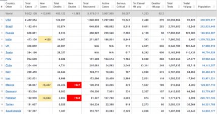 Кількість хворих на коронавірус в світі вже перевищує 9,5 млн осіб. За останню добу в світі діагностували понад 173 тисяч нових випадків. Більше кількість хворих зростає в США і Бразилії - там за добу зафіксували 39064 і 40995 нових випадків захворювання відповідно. На третьому місці по захворюваності в світі знаходиться Росія - в цій країні число хворих сягає майже 607 тисяч. На сьогоднішній день 3,868 млн осіб продовжують хворіти, померли від ускладнень, викликаних COVID-19, 485 тисяч людей, вилікувалися - 5,179 млн пацієнтів.