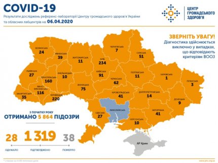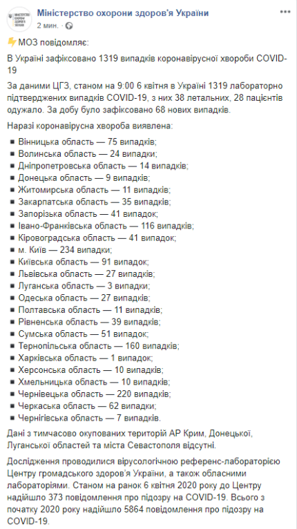 У понеділок, 6 квітня, кількість хворих на коронавірус в Україні збільшилася - станом на 09:00 підтверджено 1319 випадків зараження. Усього в Україні зафіксовано 38 летальних випадків від COVID-19. Загалом 28 осіб уже одужало — повторне лабораторне дослідження не виявило вірусу в організмі. За добу було зафіксовано 68 нових випадків. Про це повідомляє ONLINE.UA з посиланням на пресслужбу Міністерства охорони здоров'я України.