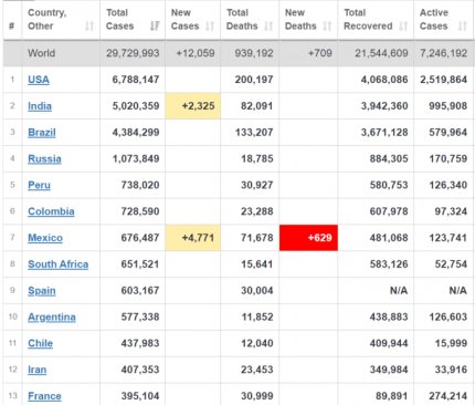 На даний момент в світі за тиждень діагностують майже 2 млн нових випадків COVID-19. Раніше число підтверджених випадків за тиждень коливалося в межах 500-600 тисяч в травні і 700-800 тисяч на початку червня. На сьогоднішній день більше 7,2 млн осіб продовжують хворіти, померли від ускладнень, викликаних COVID-19, 939 тисяч людей, вилікувалися - більш 21,5 млн пацієнтів.