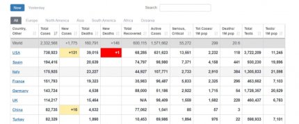 Станом на ранок 19 квітня число хворих на коронавірус в усьому світі вже сягнуло 2 328 124 випадків. Окрім того, зазначається, що 594 192 осіб одужала та 160 518 померло від ускладнень, спричинених хворобою. Зокрема, у Штатах 734 552 ( + 29 057 за минулу добу ) випадків захворювання на коронавірус, в Іспанії 194 416 ( +3577 ), Італії 175 925 ( +3491 ). Варто звернути увагу на те, що найбільше померлих від вірусу у США, Італії та Іспанії. Найбільше випадків одужання зафіксували у ФРН, КНР, Іспанії
