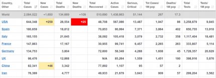 На ранок 16 квітня число хворих на коронавірус в усьому світі вже перевищило 2 млн - зафіксовано 2 084 022 випадків зараження, з них майже 511 тисяч пацієнтів одужали, 134 669 померли від ускладнень, викликаних хворобою. У США вже зафіксували 644 348 випадків захворювання на коронавірус - за останню добу майже 30 тисяч нових випадків. У Великій Британії захворіли коронавірусною хворобою 98 476 людей, у Франції - 147 863, Іспанії 180 659, Китаї 82 341, з яких майже 78 тисяч осіб одужали, в Німеччині 134 753.