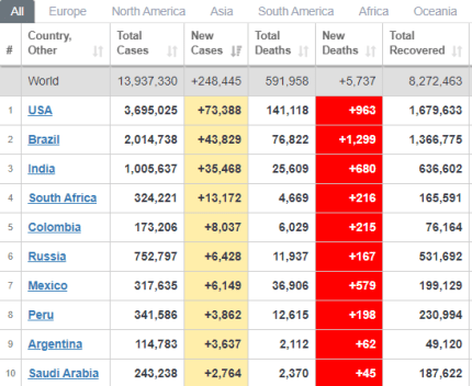 За час пандемії зареєстрували 13 млн 937 тис випадків зараження, із яких майже 592 тис – летальні. Наразі вилікувались 8 млн 268 тис хворих. 16 липня у світі зареєстрували 248 тис нових випадків захворювання на коронавірус. За цей час у США підтвердили 73 тис нових хворих, у Бразилії – майже 44 тис, в Індії – 35,5 тисяч, у Південній Африці – більше 13 тис, у Колумбії – 8 тис, у Росії – 6,4 тис, у Мексиці – більше 6 тис. Цього ж дня від ускладнень коронавірусу померли 5736 осіб. Зокрема у Бразилії зафіксували 1299 смертей, у США – 962, в Індії – 680, у Мексиці – 579, у Південній Африці – 216.