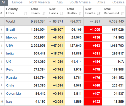 Варто звернути увагу на те, що загалом за час пандемії у світі виявили 9 млн 903 тис випадків захворювання на коронавірусну хворобу, із яких 496 тис – летальні. Перемогли COVID-19 вже 5 млн 357 тис хворих. 26 червня у світі було зареєстровано 194 тис нових випадків захворювання на коронавірус. Найбільше нових хворих виявили у США та Бразилії – близько 47 тис. Також понад 18 тис випадків підтвердили в Індії, більше 6 тис зафіксували в Росії, Південній Африці та Мексиці.Цього ж дня у світі померла 4891 людина. З них 1055 жертв зареєстрували у Бразилії, 736 – у Мексиці, 663 – в США та 381 летальний випадок в Індії.
