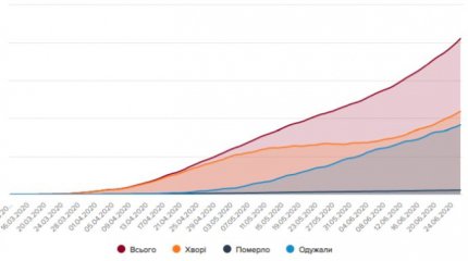 Кількість хворих на коронавірус в Україні продовжує невпинно зростати - в п'ятницю, 26 червня, зафіксовано 1 109 нових випадків зараження - це абсолютний антирекорд в нашій країні. Загальна кількість хворих COVID-19 досягає вже 41 117 осіб, з них 1086 людей померли через ускладнення, викликаних коронавірусною хворобою. Вже 18 229 українських громадян змогли перемогти коронавірус - повторне лабораторне дослідження не виявило COVID-19 в їх організмі. Про це повідомляє ONLINE.UA з посиланням на офіційні дані Міністерства охорони здоров'я та РНБО.