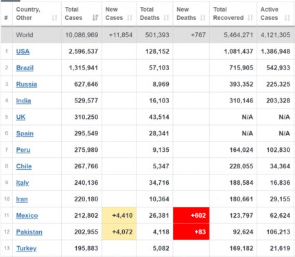Кількість хворих на коронавірус в світі вже перевищила 10 млн осіб. За останню добу в світі діагностували більше 176 тисяч нових випадків. Більше кількість хворих зростає в США і Бразилії - там за добу зафіксували 43581 і 35887 нових випадків захворювання відповідно. На третьому місці по захворюваності в світі знаходиться Росія - в цій країні число хворих перевищує 627 тисяч. На сьогоднішній день 4,121 млн осіб продовжують хворіти, померли від ускладнень, викликаних COVID-19, понад 500 тисяч людей, вилікувалися - 5,464 млн пацієнтів.