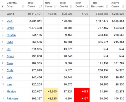 Кількість хворих коронавірусів в світі вже сягає майже 10,5 млн осіб. За останню добу в світі діагностували понад 160 тисяч нових випадків. Більше кількість хворих зростає в США і Бразилії - там за добу зафіксували 44734 і 25234 нових випадків захворювання відповідно. На третьому місці по захворюваності в світі знаходиться Росія - в цій країні число хворих перевищує 641 тисяч. На сьогоднішній день 4,235 млн осіб продовжують хворіти, померли від ускладнень, викликаних COVID-19, більш 508 тисяч людей, вилікувалися - 5,668 млн пацієнтів.