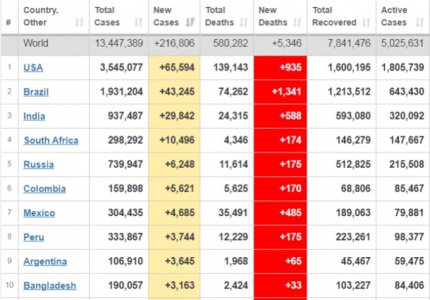 З понад 13 мільйонів діагностованих випадків коронавірусу, продовжують боротися з хворобою близько 5 мільйонів пацієнтів по всьому світу. 7 мільйонів хворих одужали, 580 тисяч померли. 13 липня у світі в 143 країнах діагностували 216 806 заражень коронавірусом, 5346 пацієнтів померло. В США за минулу добу діагностували 65 594 (935 пацієнтів померло) випадків коронавірусу, в Бразилії 43 245 (1341 померло), в Індії 29 842 (588 померло), ПАР 10 496 (174 померло), влада в Росії, яку підозрюють у приховувані статистики щодо кількості хворих, звітує про 6248 випадків коронавірусу (175 померло) та інші. У Китаї за офіційною інформацією діагностовано 83 611 випадків захворювання на коронавірус, 78 693 пацієнтів вже одужали, 4634 померли, 284 пацієнта продовжують боротися з хворобою.