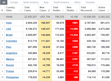 Варто звернути увагу на те, що 20 серпня у світі виявили 267 тис нових випадків захворювання на коронавірус та зареєстрували 6188 смертей. Найбільше випадків коронавірусу підтвердили в Індії – 68,5 тис. Також у США зафіксували 45 тис нових хворих, у Бразилії – більше 44 тис, у Колумбії – 11,5 тис, у Перу та Аргентині – більше 8 тисяч. Україна наразі займає 17 місце у світі за кількістю нових хворих за добу. Загалом у світі 22,8 млн випадків захворювання, із яких 797 тис – летальні. Наразі побороли коронавірус 15,5 млн хворих. Як уже зазначалося раніше, за добу 19 серпня коронавірусну хворобу в Україні підтвердили 2 134 особам, було госпіталізовано 407 хворих, померли 40 пацієнтів із COVID-19 – це одразу три антирекорди.