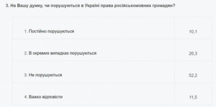 "Більшість українців (52%) вважають, що в Україні не порушують прав російськомовних громадян. Ще 26% вважають, що права російськомовних в окремих випадках порушуються, 10% говорять про постійні порушення", — йдеться в повідомленні.