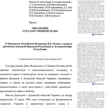 Державна дума Федеральних Зборів Російської Федерації звертається до Вас, шановний Володимир Володимирович, з проханням розглянути питання про визнання Російською Федерацією Донецької Народної Республіки і Луганської Народної Республіки як самостійних, суверенних і незалежних держав, - йдеться у підготовленному проєкті.
