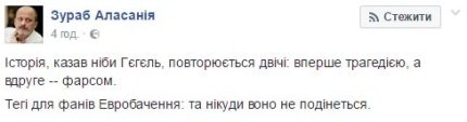 Журналіст і екс-генеральний директор Національної телекомпанії України Зураб Аласанія прокоментував ситуацію так: "Історія, говорив би Гегель, повторюється двічі: перший раз трагедією, а другий - фарсом. Теги для фанів Євробачення: та нікуди воно не дінеться".