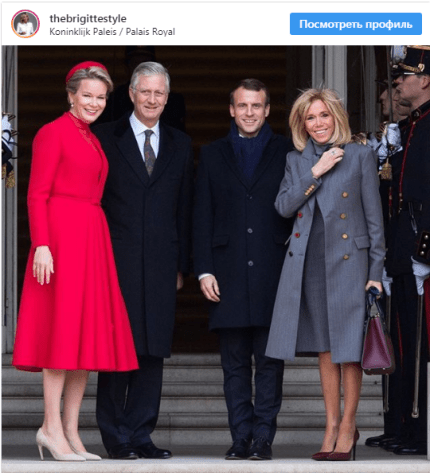 Цього разу користувачів соцмережі підкорили фото, на яких королева Матильда та перша леді Франції йдуть червоною доріжкою у кардинально різних нарядах. Для світського виходу, який відбувався вдень, Бріджит обрала образ у сірому кольорі від Louis Vuitton. Сукню та двобортне пальто доповнили лакові туфлі-човники бордового кольору та сумка в тон взуття. До слова, вартість сумки від Louis Vuitton – 3350 доларів.