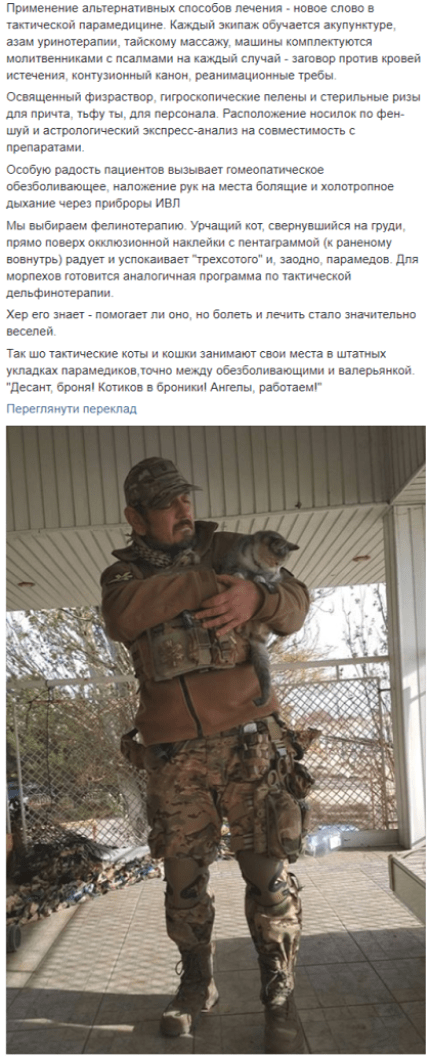 "Так шо тактичні коти і кішки займають свої місця в штатних укладаннях парамедиків, точно між знеболюючими і валеріаною." Десант, броня! Котиків в Броники! Ангели, працюємо!" - додав Gorky Look.