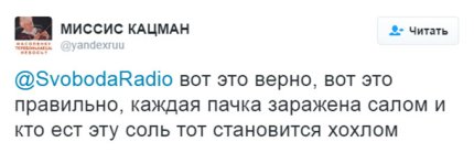 «Ось це вірно, ось це правильно, кожна пачка заражена салом, і хто їсть цю сіль, той стає хохлом», - іронізує в Twitter «Місіс КАЦМАН».