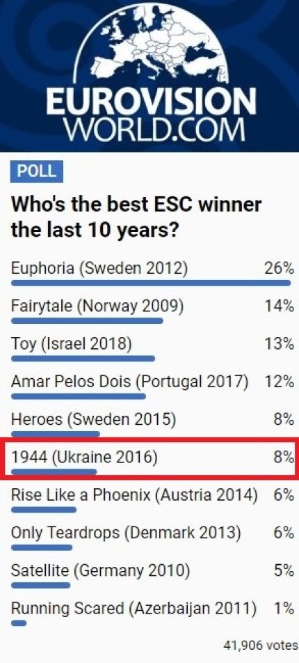 Організатори "Євробачення" запустили голосування на кращу пісню минулих років. У ТОП-10 потрапила українська співачка Джамала з піснею "1944", з якою вона перемогла на конкурсі в 2016 році, передає ONLINE.UA.