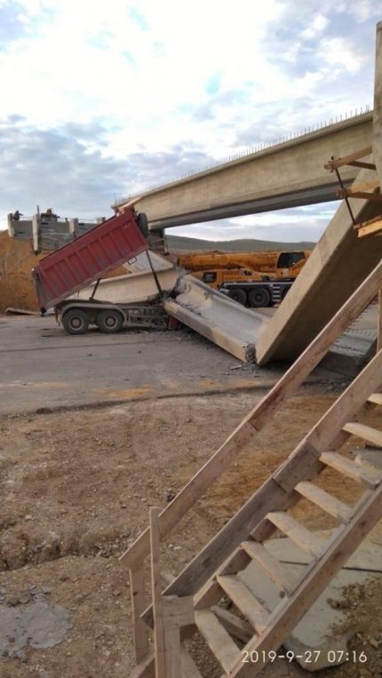 Ділянка траси "Таврида", що будується на Кримському мосту, повністю обрушилася в результаті страшної аварії. Інцидент стався напередодні через водія самоскида, який врізався в конструкцію і збив дві укладені балки шляхопроводу. Відео аварії, опубліковане очевидцями події, набуло масового поширення в мережі, повідомляє ONLINE.UA.