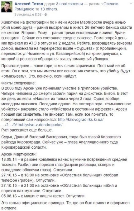 "Факти такі: У 2006 році Арсен вже брав участь в груповому вбивстві. Чотири людини до смерті забили хлопця на дискотеці. Битою. В цей же день зникли. «Знайшли» їх тільки через 3 роки. Суддя взагалі молодцем виявився. Посадили одного. На півтора року. «Умисне вбивство» раптово стало «вбивством в стані афекту». Арсен пройшов як свідок. Не винен", - написав волонтер.