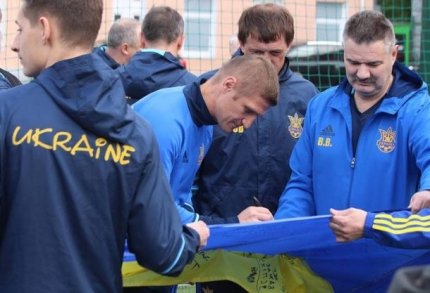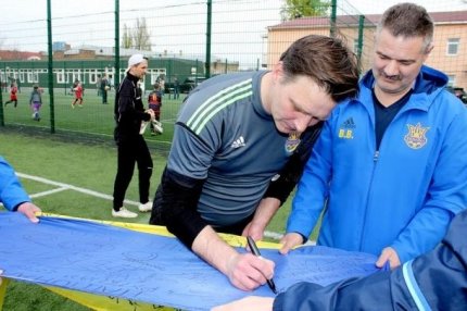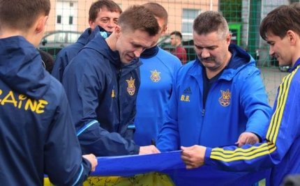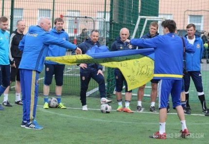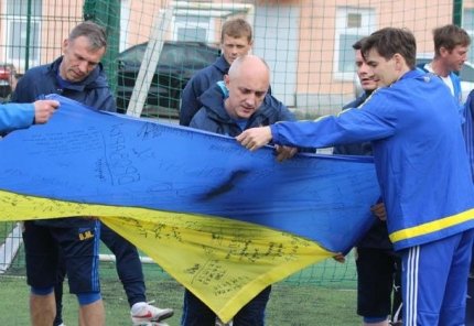 Як повідомляє ONLINE.UA, футболісти збірної України серед ветеранів залишили підписи і побажання на українському прапорі, який у четвер відправиться у Лондон.