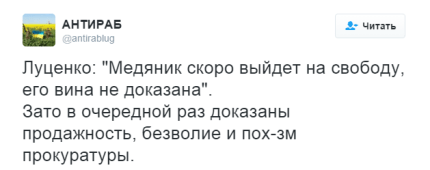 "Якщо відносно пана Медяника немає достатньо доказів, то він не буде залучатися до кримінальної відповідальності. Це моя впевненість в тому, що прокуратура може і повинна звільняти людей, якщо немає достатньо доказів. Я впевнений, що пан Медяник найближчим часом вийде з- під арешту, бо у нас не зібрані докази його провини", - сказав Луценко журналістам у Національній академії прокуратури в Києві.