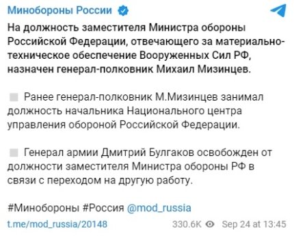 На тлі останніх провалів російської армії Міноборони РФ сколихнули нові звільнення та перестановки. Так, 24 вересня офіційно стало відомо, що генерала-полковника Михайла Мізінцева, який керував облогою Маріуполя, призначили на посаду заступника міністра оборони Росії, який відповідає за матеріально-технічне забезпечення Збройних сил РФ.